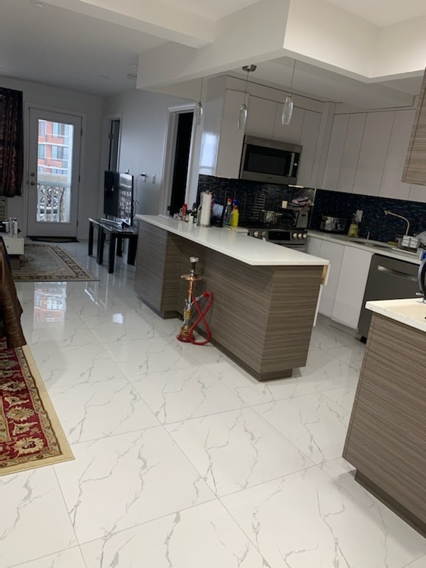 The apartment has a built-in microwave and dishwasher with stainless steel appliances